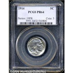 <B>1914<5C> PR64 PCGS.</B></I> Nicely struck save for minor softness in the central portion of the obverse, this specimen reveals just the slightest hint of light-gold and pale-lavender toning. A couple of faint, hardly noticeable pinscratches are concealed within the Indian's portrait.<BR><I>From The Barry Donnell Collection.</B></I> <BR><BR><B>Important notice:</B> Heritage usually auctions material at the rate of 200-250 lots per hour. On some occasions eBay Live bid software or the Internet may not be able to keep up with the pace of the auction. We recommend placing a realistic absentee bid now as insurance to avoid disappointment. Occasionally the auctioneer may eliminate or reject an eBay Live bid, and the auctioneer may also reopen a lot after the close of the eBay live bidding (usually because we missed an audience bid), and may reject your bid even if it shows you as the winning bidder. By bidding via eBay Live, you agree that Heritage may award the lot to another bidder at its sole discretion under the circumstances described above or any other reasonable circumstances. Since eBay bids are not shown to us until we open the lot on the floor, we treat those bids just like floor bids. In most cases the floor responds before the eBay bid is presented to us, due to Internet lag time, so for consistency we have made it a policy that floor bids are always considered first over tie eBay live bids. Also please note that all Heritage lots purchased through eBay Live carry a 20% Buyer's Premium. Please make sure you read the Terms and Conditions before you bid.