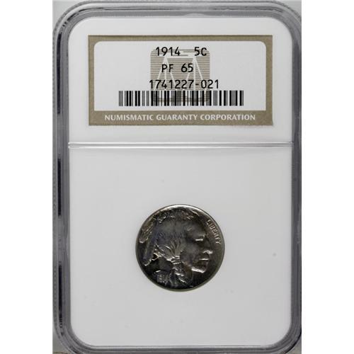 <B>1914 5C PR65 NGC.</B></I> A crisply struck Gem that has yellow, blue-green, and violet-red patina over the textured surfaces. Only a few small points of contact appear on the surfaces.<BR><I>From The James Paul Collection.</B></I><BR><BR><b>Shipping:</b> Coin/Currency (<a target="_blank" href="http://www.heritageauctions.com/common/shipping.php">view shipping information</a>)