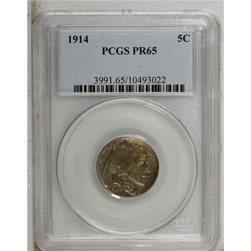 <B>1914<5C> PR65 PCGS.</B></I> Streaks of amber, olive, and ice-blue toning predominate on this crisply struck and problem-free Gem proof, one of the survivors from the original proof mintage of only 1,275 pieces. No spots or contact evidence is visible, and the coin appears conservatively graded.