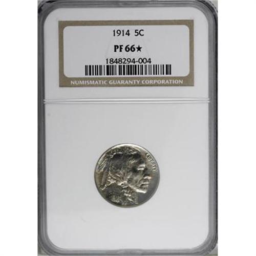 <B>1914 5C PR66 <img src="/images/star.gif" width="10" height="10" alt="" border="0"> NGC.</B></I> A needle-sharp and satiny Premium Gem with light gold toning and outstanding eye appeal. Because commercial issue Buffalo nickels seldom have close to a full strike, proofs may be the best method of representing the type. The proof 1914 has a low production of 1,275 pieces. Census: 1 in 66 <B><img src="/images/star.gif" width="10" height="10" alt="" border="0"></B></I>, 3 finer with a Star designation (11/07).<BR><I>From The New York Eye Appeal Collection, Part Three.</B></I><BR><BR><b>Shipping:</b> Coins & Currency (<a target="_blank" href="http://www.heritageauctions.com/common/shipping.php">view shipping information</a>)