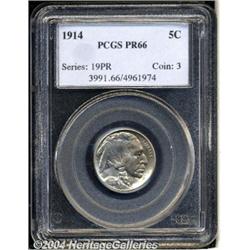 <B>1914<5C> PR66 PCGS.</B></I> The mintage for 1914 matte proof Buffalo Nickels was 1,275 pieces, and while not a large production run in the absolute sense, this is one of the more frequently encountered dates in series. The matte surfaces are satiny and each side is partially covered with light golden toning. Close inspection is required to locate any post-striking flaws that prevent an even higher grade. Population: 89 in 66, 57 finer (3/04). <BR><BR><B>Important notice:</B> Heritage usually auctions material at the rate of 200-250 lots per hour. On some occasions eBay Live bid software or the Internet may not be able to keep up with the pace of the auction. We recommend placing a realistic absentee bid now as insurance to avoid disappointment. Occasionally the auctioneer may eliminate or reject an eBay Live bid, and the auctioneer may also reopen a lot after the close of the eBay live bidding (usually because we missed an audience bid), and may reject your bid even if it shows you as the winning bidder. By bidding via eBay Live, you agree that Heritage may award the lot to another bidder at its sole discretion under the circumstances described above or any other reasonable circumstances. Since eBay bids are not shown to us until we open the lot on the floor, we treat those bids just like floor bids. In most cases the floor responds before the eBay bid is presented to us, due to Internet lag time, so for consistency we have made it a policy that floor bids are always considered first over tie eBay live bids. Also please note that all Heritage lots purchased through eBay Live carry a 20% Buyer's Premium. Please make sure you read the Terms and Conditions before you bid.