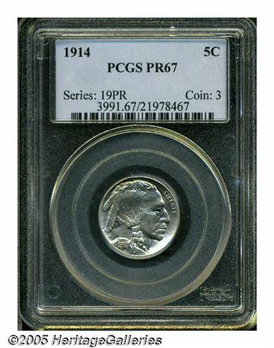 <B>1914<5C> PR67 PCGS.</B></I> Sharply struck and highly lustrous with bright nickel-gray color and accents of pale gold. The surfaces of this Superb Gem example are nearly perfect. Just a little more color and luster is all that's missing, preventing an even higher grade. As it is, PCGS has certified less than 10 finer examples, thus this piece represents an excellent addition for nearly any collector and connoisseur. Population: 55 in 67, 8 finer (5/05).