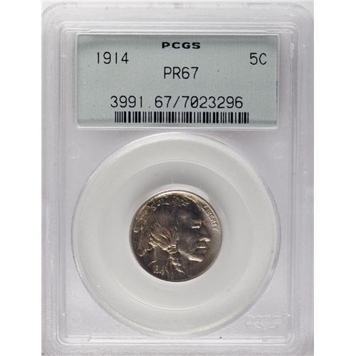 <B>1914 5C PR67 PCGS.</B></I> Stunning visual appeal and almost perfectly preserved surfaces. Both sides show a bright appearance that is complemented with lilac and gold patina. This coin simply must be seen to be fully appreciated. Housed in an old green label holder. Population: 57 in 67, 8 finer (12/06).<BR><BR><b>Shipping:</b> Coin/Currency (<a target="_blank" href="http://www.heritageauctions.com/common/shipping.php">view shipping information</a>)