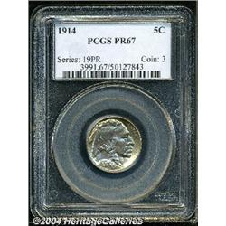 <B>1914<5C> PR67 PCGS.</B></I> The intricately detailed features are proof of a full strike, and the faintly granular matte surfaces seem to be pristine. Bright gold, crimson, lime-green, and sky-blue toning adorns the peripheral areas of each side lending a fully original appearance. A truly outstanding Superb Gem. Population: 52 in 67, 7 finer (9/04). <BR><BR><B>Important notice:</B> Heritage usually auctions material at the rate of 200-250 lots per hour. On some occasions eBay Live bid software or the Internet may not be able to keep up with the pace of the auction. We recommend placing a realistic absentee bid now as insurance to avoid disappointment. Occasionally the auctioneer may eliminate or reject an eBay Live bid, and the auctioneer may also reopen a lot after the close of the eBay live bidding (usually because we missed an audience bid), and may reject your bid even if it shows you as the winning bidder. By bidding via eBay Live, you agree that Heritage may award the lot to another bidder at its sole discretion under the circumstances described above or any other reasonable circumstances. Since eBay bids are not shown to us until we open the lot on the floor, we treat those bids just like floor bids. In most cases the floor responds before the eBay bid is presented to us, due to Internet lag time, so for consistency we have made it a policy that floor bids are always considered first over tie eBay live bids. Also please note that all Heritage lots purchased through eBay Live carry a 20% Buyer's Premium. Please make sure you read the Terms and Conditions before you bid.
