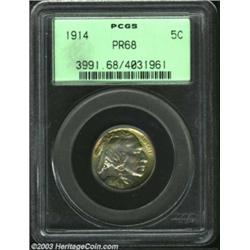 <TABLE cellSpacing=0 cellPadding=0 width="100%" bgColor=#000000 border=0><TBODY><TR><TD width="100%"><TABLE cellSpacing=1 cellPadding=3 width="100%" border=0><TBODY><TR><TD width="100%" bgColor=#79735c><FONT face=arial color=#ffffff size=3><B>Description</B> </FONT></TD></TR><TR><TD width="100%" bgColor=#ffffff><FONT face=arial size=2><B>1914 5C PR68 PCGS.</B></I> While the 1914 is one of the more frequently encountered matte proofs in the series, there is nothing ordinary or common about this coin in PR68 condition. Only six other pieces have been so graded by PCGS with none finer at either service (4/03). What sets this coin apart and lifts it to the PR68 threshold are not just the immaculately preserved surfaces and needle-sharp striking details. What grabs one's attention immediately is the profound, multicolored iridescent toning that covers each side. We could go on and on about the different colors and their configurations, but this coin will capture someone's attention at lot viewing who will simply have to own it and they will hold their bidding paddle up until all other competitors drop out. </FONT></TD></TR></TBODY></TABLE></TD></TR></TBODY></TABLE><BR><A name=PricesRealized></A><TABLE cellSpacing=0 cellPadding=0 width="100%" bgColor=#000000 border=0><TBODY><TR><TD width="100%"><TABLE cellSpacing=1 cellPadding=3 width="100%" border=0><TBODY><TR><TD width="100%" bgColor=#79735c><A name=PR><FONT face=arial color=#ffffff size=3><B>Previous Prices from Heritage Auctions</B> </FONT></A></TD></TR><TR><TD bgColor=#f6f6ed><TABLE cellSpacing=0 cellPadding=0 width="100%" border=1><TBODY><TR><TD align=middle width="33%"><B>Date</B></TD><TD align=middle width="33%"><B>Service</B></TD><TD align=middle width="33%"><B>Price</B></TD></TR><TR bgColor=whitesmoke><TD width="33%"><B>01/11/2003</B></TD><TD width="33%">PCGS</TD><TD width="33%">$20,700.00</TD></TR><TR bgColor=whitesmoke><TD width="33%"><B>03/21/2002</B></TD><TD width="33%">PCGS</TD><TD width="33%">$13,800.00</TD></TR><TR bgColor=whitesmoke><TD width="33%"><B>05/03/2003</B></TD><TD width="33%">NGC</TD><TD width="33%">$17,253.45</TD></TR></TBODY></TABLE></TD></TR><TR><TD bgColor=#ffffff><FONT face=arial size=1 ?>PLEASE NOTE: All prices realized reflect the final hammer price PLUS the buyer's premium in auctions that charge a buyer's premium. Each item has a notation at the top of the listing indicating whether that lot included a buyer's premium. Example: A item that sells with a final hammer price of $100 and a 20% buyer's premium will display with a price realized of $120. All information listed is intended to be as accurate as possible, but errors are possible. Please use this guide carefully and inform us of any inaccuracies. </FONT></TD></TR></TBODY></TABLE></TD></TR></TBODY></TABLE><BR><TABLE cellSpacing=0 cellPadding=0 width="100%" bgColor=#000000 border=0><TBODY><TR><TD width="100%"><TABLE cellSpacing=1 cellPadding=3 width="100%" border=0><TBODY><TR><TD width="100%" bgColor=#79735c colSpan=6><FONT face=arial color=#ffffff size=3><B>Price Guide*</B> </FONT></TD></TR><TR bgColor=#f6f6ed><TD align=middle><B>Grade</B> </TD><TD align=middle><B>Coin World<BR>(Trends)</B> </TD><TD align=middle><B>Numismedia<BR>Retail</B> </TD><TD align=middle><B>Numismedia<BR>Wholesale</B> </TD><TD align=middle><B>Coin<BR>Universe</B> </TD><TD align=middle><B>Heritage<BR>Value Index</B> </TD></TR><TR bgColor=#ffffff><TD align=middle>67</TD><TD align=right>---</TD><TD align=right>---</TD><TD align=right>$3,175.00</TD><TD align=right>$5,000.00</TD><TD align=right>$3,158.67</TD></TR><TR style="FONT-WEIGHT: bold" bgColor=#cccfdd><TD align=middle>68</TD><TD align=right>---</TD><TD align=right>---</TD><TD align=right>$7,275.00</TD><TD align=right>---</TD><TD align=right>---</TD></TR><TR bgColor=#ffffff><TD align=middle>69</TD><TD align=right>---</TD><TD align=right>---</TD><TD align=right>---</TD><TD align=right>---</TD><TD align=right>---</TD></TR><TR bgColor=#ffffff><TD colSpan=6><FONT size=1>*All information listed is intended to be as accurate as possible, but errors are possible. No item may be returned or refused based on this information which is provided as a service to our customers. You should contact each pricing source directly to determine the accuracy of this information. </FONT></TD></TR></TBODY></TABLE></TD></TR></TBODY></TABLE><BR><TABLE cellSpacing=0 cellPadding=0 width="100%" bgColor=#000000 border=0><TBODY><TR><TD width="100%"><TABLE cellSpacing=1 cellPadding=3 width="100%" border=0><TBODY><TR><TD width="100%" bgColor=#79735c><FONT face=arial color=#ffffff size=3><B>Population Guide</B> </FONT></TD></TR><TR bgColor=#ffffff><TD align=middle><!-- Begin Output of Population Grid--><TABLE cellSpacing=0 cellPadding=0 width="100%" border=0><TBODY><TR><TD vAlign=center><TABLE cellSpacing=0 width="100%" border=1 cellsadding="3"><TBODY><TR><TD vAlign=center><TABLE cellSpacing=0 cellPadding=3 width="100%" border=1><TBODY><TR><TD vAlign=center align=middle bgColor=#f0f1e8 colSpan=2 <CENTER><FONT face=Arial size=2><B>PCGS Pop </B></FONT><CENTER></CENTER></TD><TD vAlign=center align=middle bgColor=#f0f1e8 colSpan=2><CENTER><FONT face=Arial size=2><B>NGC Pop</B></CENTER></FONT></TD></TR><TR><TD vAlign=center><FONT face=Arial size=2>(68)</FONT> </TD><TD vAlign=center align=right><FONT face=Arial size=2>6</FONT> </TD><TD vAlign=center><FONT face=Arial size=2>(68)</FONT> </TD><TD vAlign=center align=right><FONT face=Arial size=2>4</FONT> </TD></TR><TR><TD vAlign=center><FONT face=Arial size=2>(>68)</FONT> </TD><TD vAlign=center align=right><FONT face=Arial size=2>0</FONT> </TD><TD vAlign=center><FONT face=Arial size=2>(>68)</FONT> </TD><TD vAlign=center align=right><FONT face=Arial size=2>0</FONT> </TD></TR></TBODY></TABLE></TD></TR></TBODY></TABLE></TD></TR></TBODY></TABLE><!-- End Output of Population Grid--> Important notice: Heritage usually auctions material at the rate of 200-250 lots per hour. On some occasions eBay Live bid software or the Inter