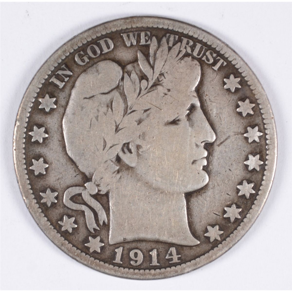 1914 BARBER HALF DOLLAR, VG/F, MOST of LIBERTY VISIBLE
