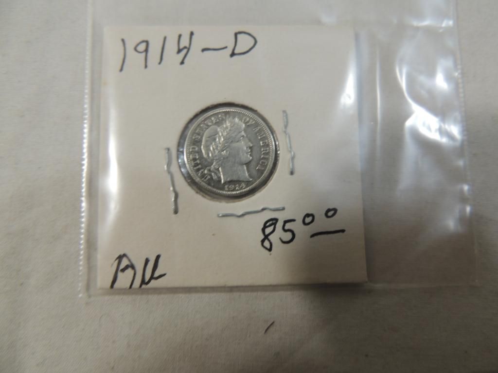 1914 BARBER SILVER DIME AU CONDITION. US CURRENCY COIN COLLECTIBLE UNITED STATES COIN AS SHOWN SEE PHOTO FOR MORE DETAILS.