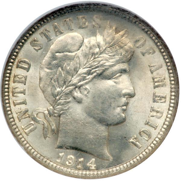 1914 Barber Dime. NGC graded MS-64. A sleek, attractive frosty white coin.