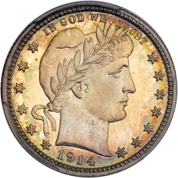 1914 Barber Quarter Dollar. PCGS graded Proof 66 Cameo PQ CAC Approved. Only 380 struck. Lovely gold tone. A naturally toned nearly superb Gem Proof with admirable luster and surfaces that are free from all but the most trifling hairlines (visible only under magnification). In the period in which this coin was made, the early 20th century, weak strikes predominate on business strikes. That is why collectors often chose to buy a Proof when the opportunity presented. It is a pleasure to report a strike with preciseness only now and then found even on the second decade Proofs of the 20th century. Pop 8; 2 finer in 67CAM (PCGS # 85700) .
