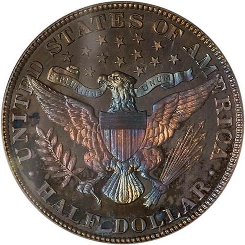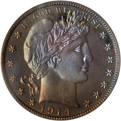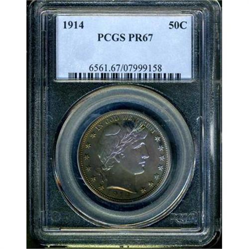 <b>1914 Barber Half Dollar. PCGS graded Proof 67.</b> Very similar toning to the 1911 just offered, and a coin of inestimable beauty for the collector. Never, you will have to assure yourself, has there been a more prominent Gem Proof 67 than this 1914 since its inception 92 years ago. When you go to your computer to get ready for bidding, or when you sit down in the auction room to compete with the crowd who want to possess it, bear this in mind. In light of that, we can also say this piece is struck with extremely full details on both sides. It must have resided in a Mint wrapper to have acquired its rich shades of color. And it can only speak volumes that PCGS awarded it the high grade of Proof 67, a grade reserved for only the most spectacular Barber half dollar Proofs. Proof mintage was only 380 pieces, the lowest mintage in the series.