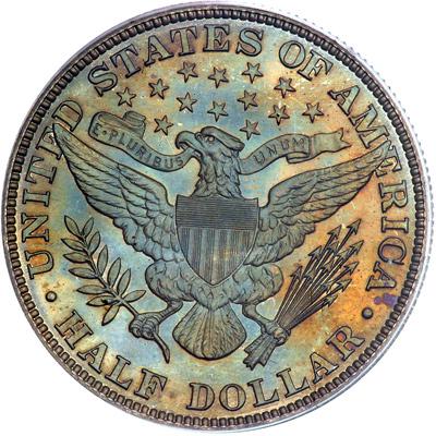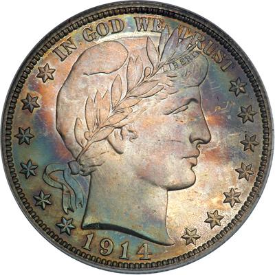 1914 Barber Half Dollar. PCGS graded Proof 67. Lovely shades of blue, green, and golden colors. Only 380 Proofs issued. A stunner! Everyone, rich or old, young or poor, even golfers with a 23-handicap, will love this coin for its superb beauty. With gleaming mirrors on both sides, the devices are highlighted by the an delightful array of original colors. This lovely Proof 67 is among the finest seen of a limited mintage of Proof 1914 half dollars. If you are assembling a Gem Proof set of Barber halves, then here is a great addition to the project, even if it means having to declare your intentions against strong competition from other bidders online, over the phone, or gripping the edges of their seats in the auction room itself. Capture a prize of this quality and it's acquisition will be the glory of any advanced collection. Pop 15; none finer at PCGS (PCGS # 6561) .