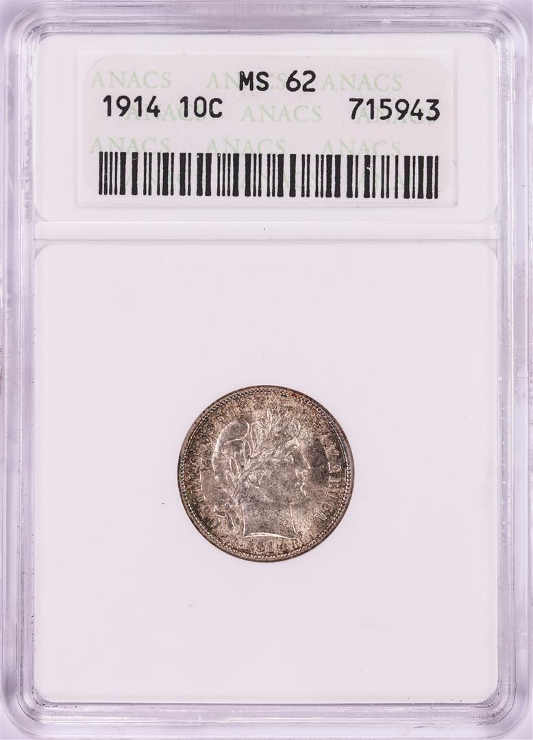 One 1914 Barber Dime Coin ANACS MS62. ANACS Certified.
