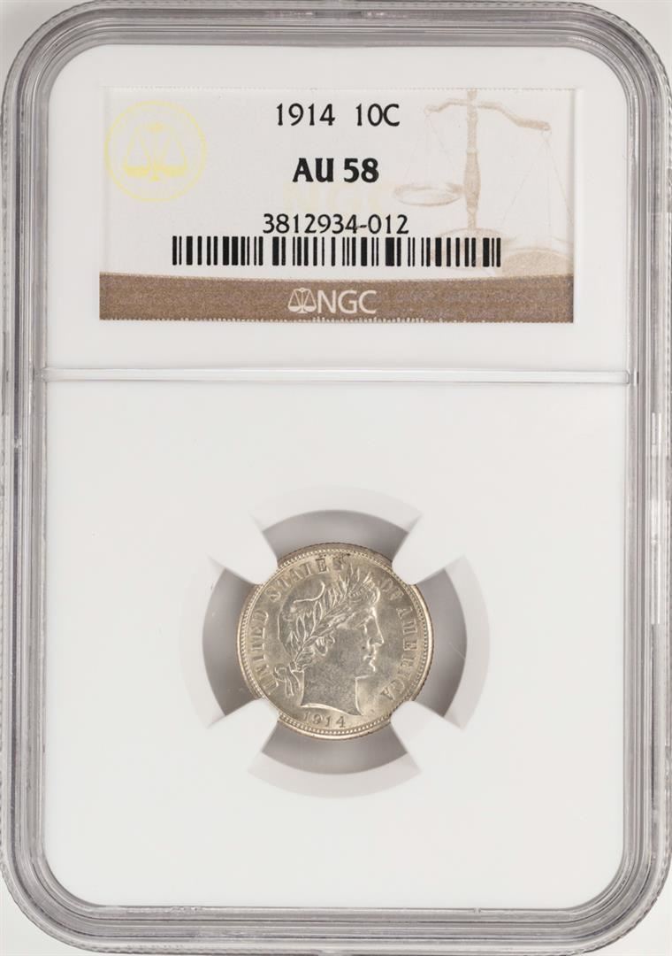 One 1914 Barber Dime Coin NGC AU58. NGC Certified.