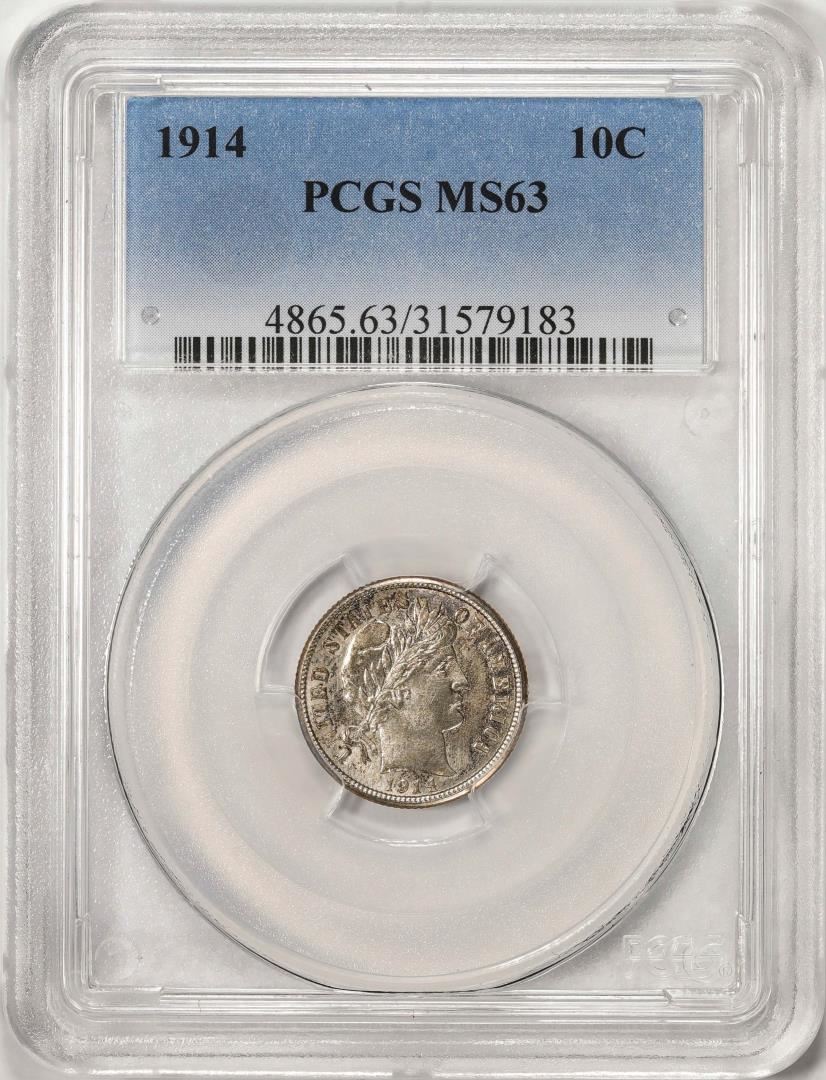 One 1914 Barber Dime Coin PCGS MS63. PCGS Graded.