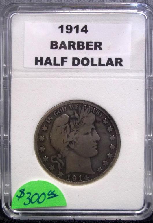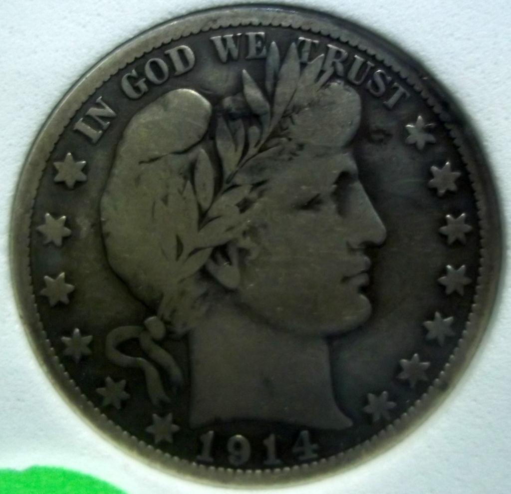 Key date 1914 Philadelphia Mint Barber Half Dollar, PCGS Online Photograde slabbed and certified Very Good-10. With only 124,610 pieces ever minted, this is the most difficult of the Barber halves to find!