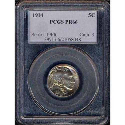 <b>1914 Buffalo Nickel. PCGS graded Proof 66.</b> Wheeling-fresh luster on nice satin-matte surfaces. Mathematically exact standards seen in the sharp head and horn of the buffalo, continuing on up across his shaggy hump and so on to the tail which shows a nice split end (buffalos didn't seem to mind). According to our observations, including the key highpoints of such as that described, the strike is way above-average, in fact sharp, in all areas <b>(PCGS # 3991)</b> <i>