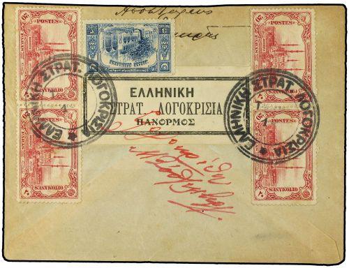 (1914 CA.) PANORMOS a GALATA. Circulada con sellos Turcos 20pa. (4) y 3pi. Mat. circular y etiqueta CENSURA MILITAR GRIEGA. ESPECTACULAR Y RARA.