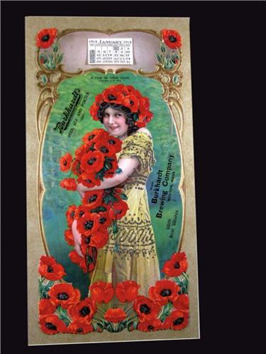 1914 Calendar for the Burkhardt Brewing Company, Boston Mass. Die cut cardboard, full pad. Framed under glass, near mint condition. 8 1/2 X 17 inches.