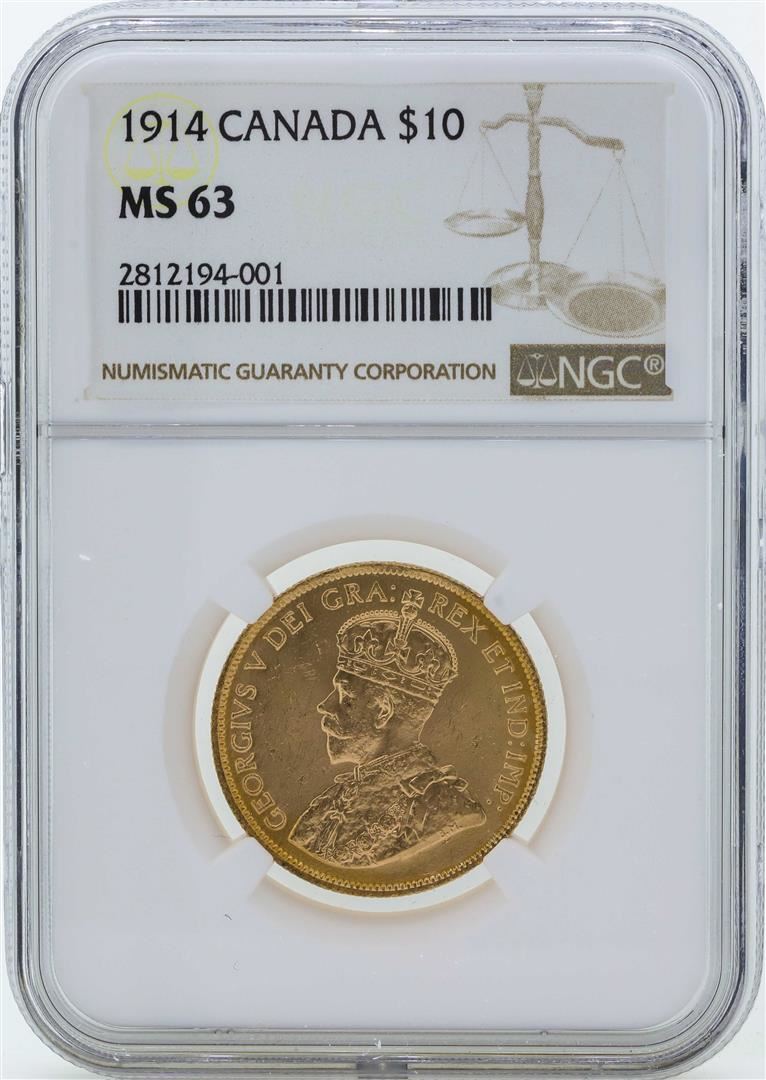 One 1914 Canada $10 George V Gold Coin NGC MS63. NGC Certified.