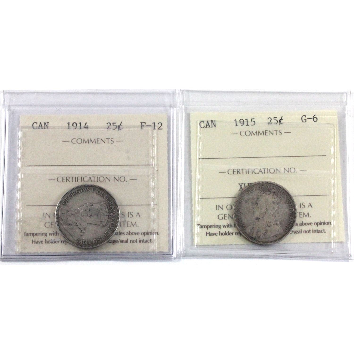 1914 Canada 25-cent ICCS Certified F-12 & 1915 25-cent ICCS G-6. 2pcs