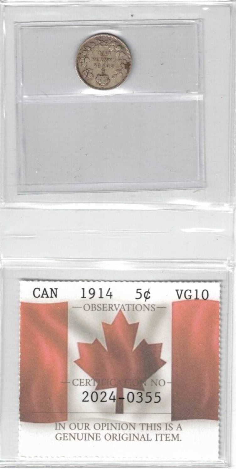 1914 Canada 5¢ Certified PCCS VG10, Professional Coin Certification System