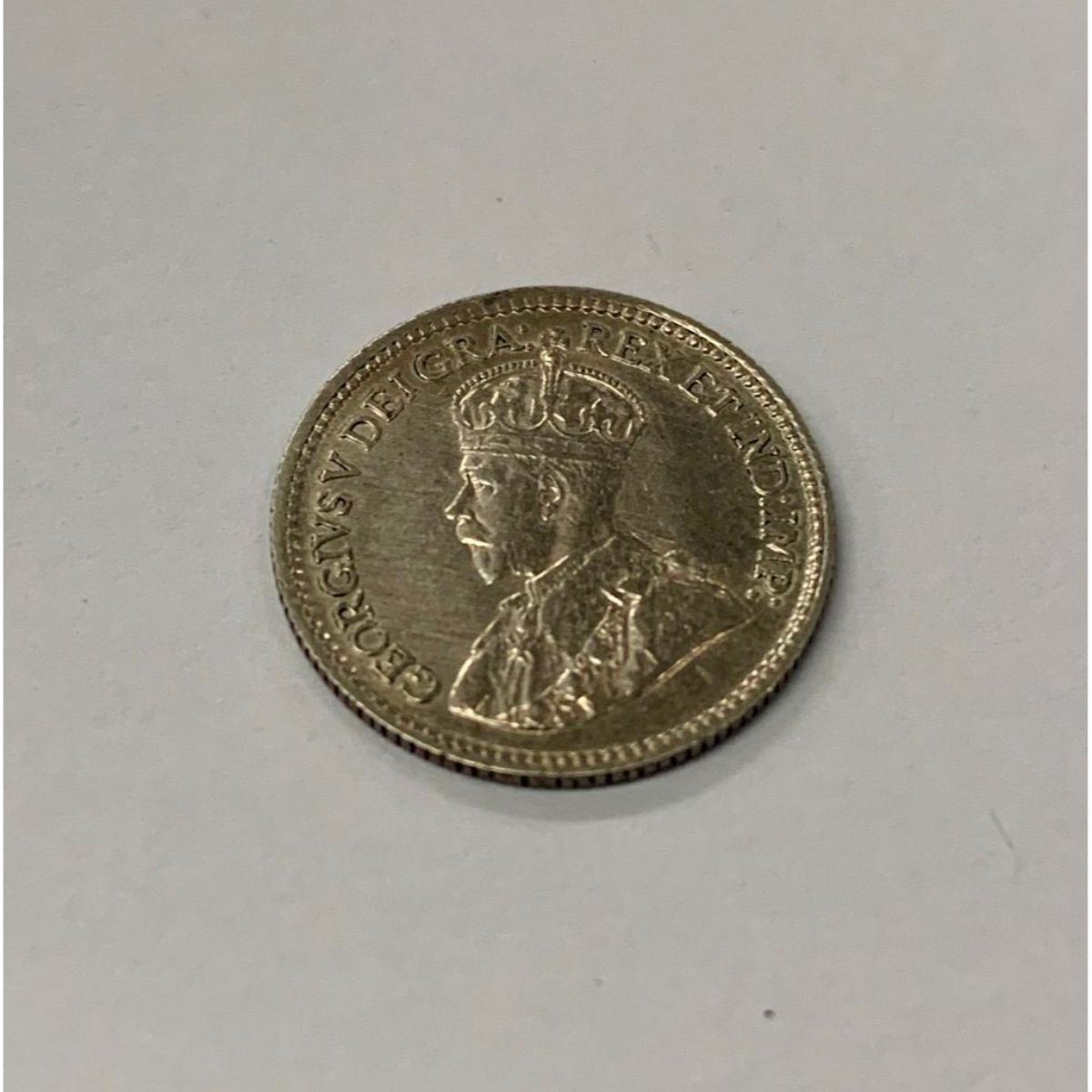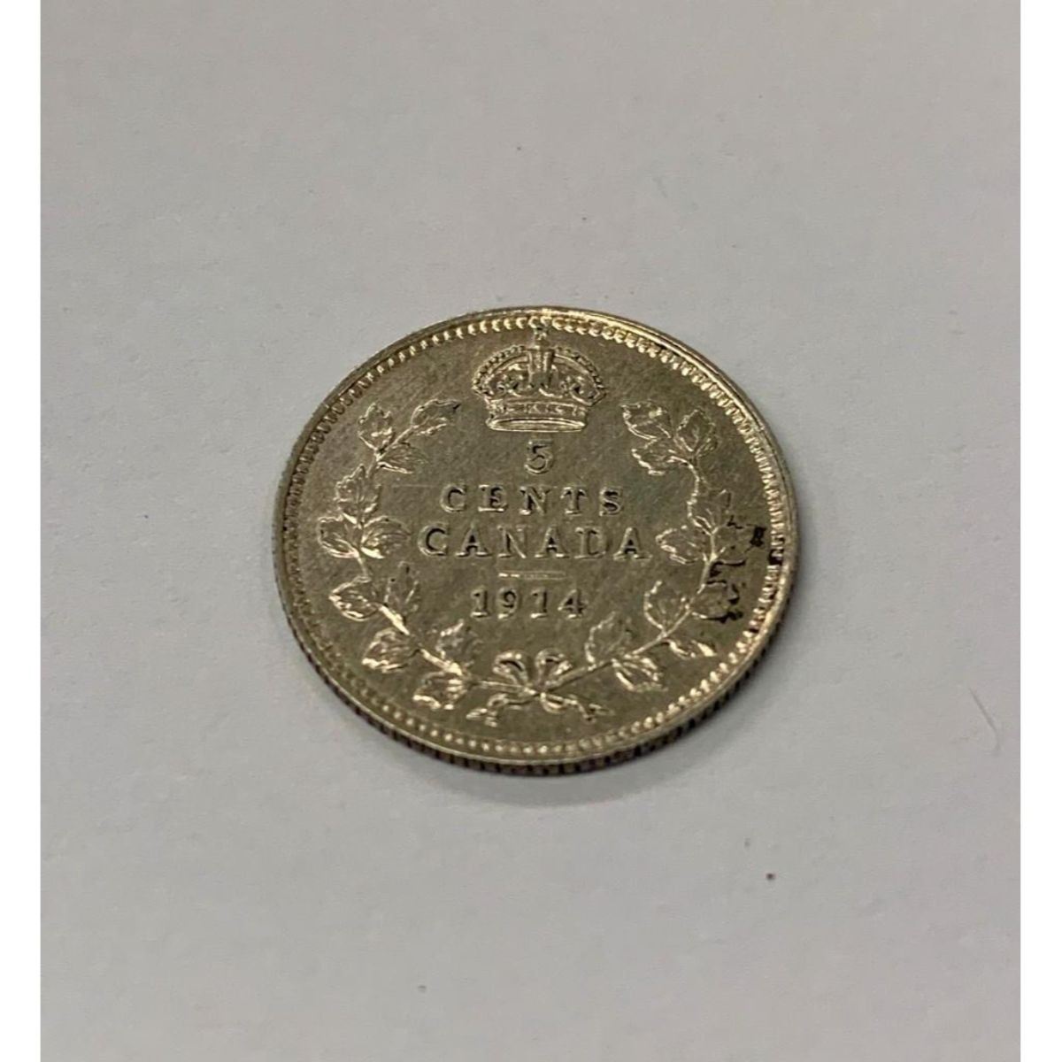 Obverse The portrait in left profile of George V is surrounded with the inscription "GEORGIVS V DEI GRA: REX ET IND:IMP" (George V, King and Emperor of India by the grace of God) Lettering: GEORGIVS V DEI GRA: REX ET IND:IMP: Engraver: Edgar Bertram MacKennal Reverse The facial value, accompanied with the inscription "CANADA", is surrounded with two maple boughs and a crown Lettering: 5 CENTS CANADA 1915 Features TypeStandard circulation coin Years1912-1919 Value5 Cents (0.05 CAD) MetalSilver (.925) Weight1.167 g Diameter15.494 mm ShapeRound OrientationMedal alignment ↑↑