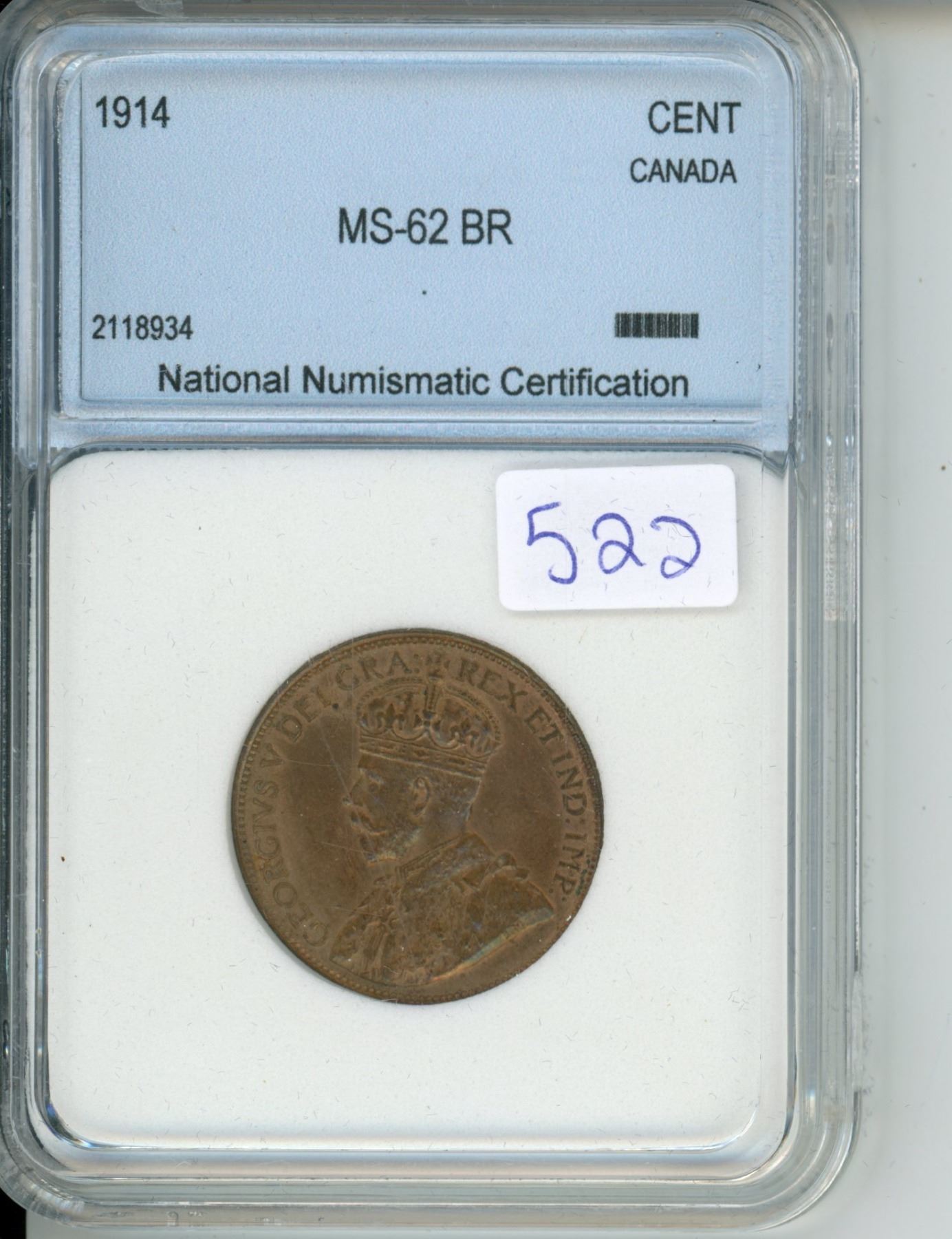 1914 Canadian NNC Graded 1 Cent Coin - MS-62 BR