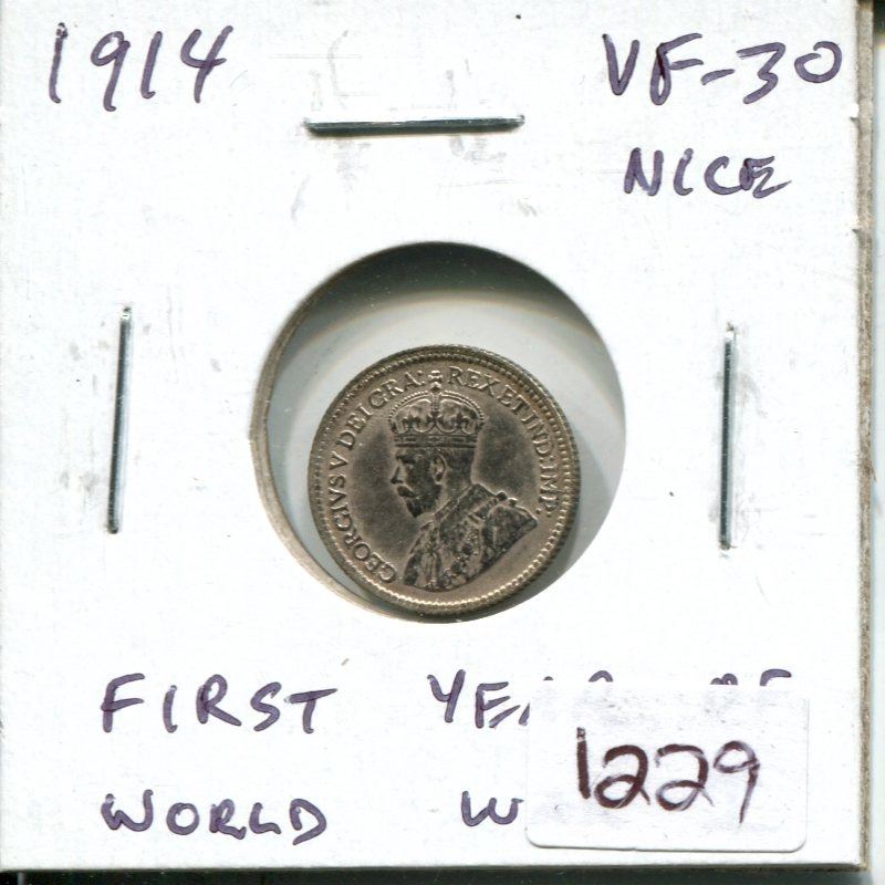 1914 Canadian Silver 5 Cents. First year of World War I. VF-30. Nice.