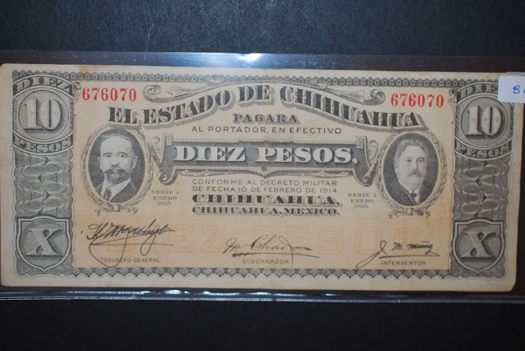 1914 Chihuahua State Diez (10) Pesos Foreign Bank Note; EST. $20-30