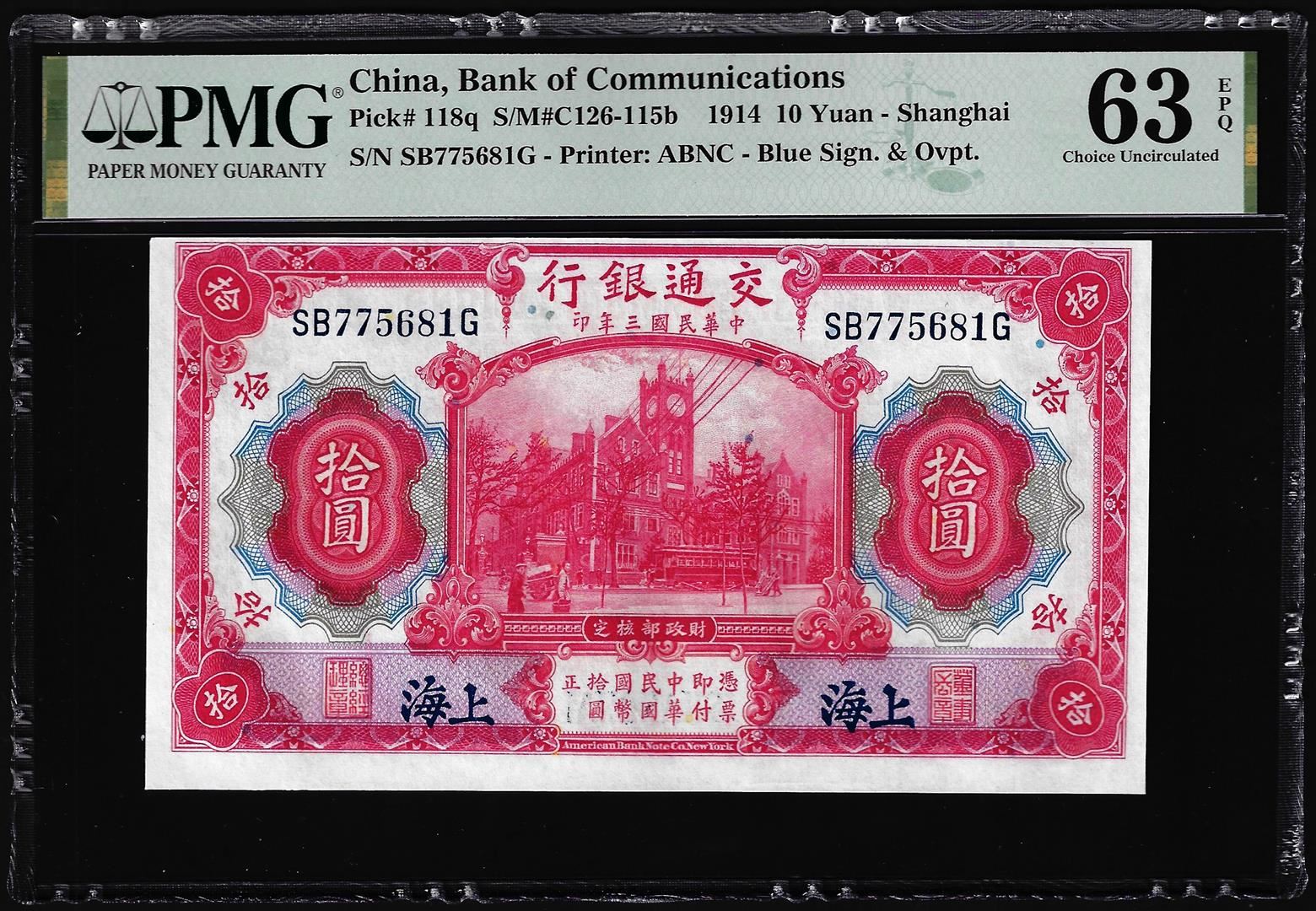 One 1914 China Bank of Communications 10 Yuan Note Pick# 118q PMG Ch. Uncirculated 63EPQ. PMG Certified.