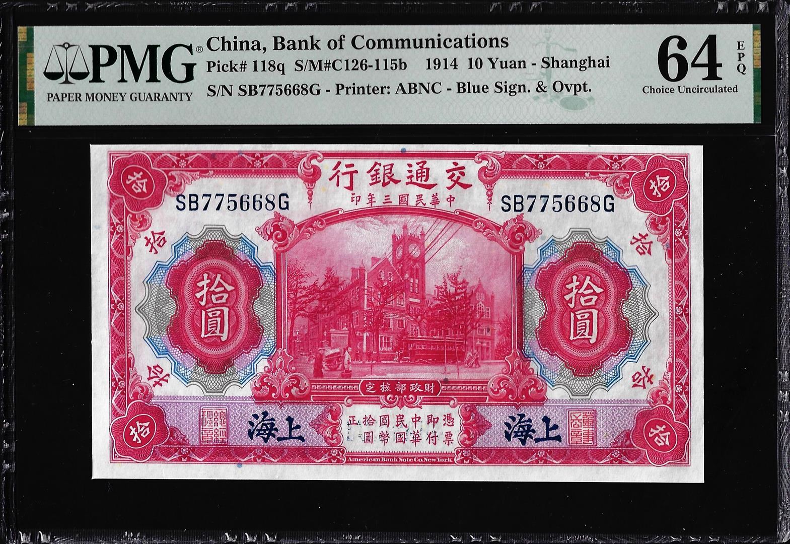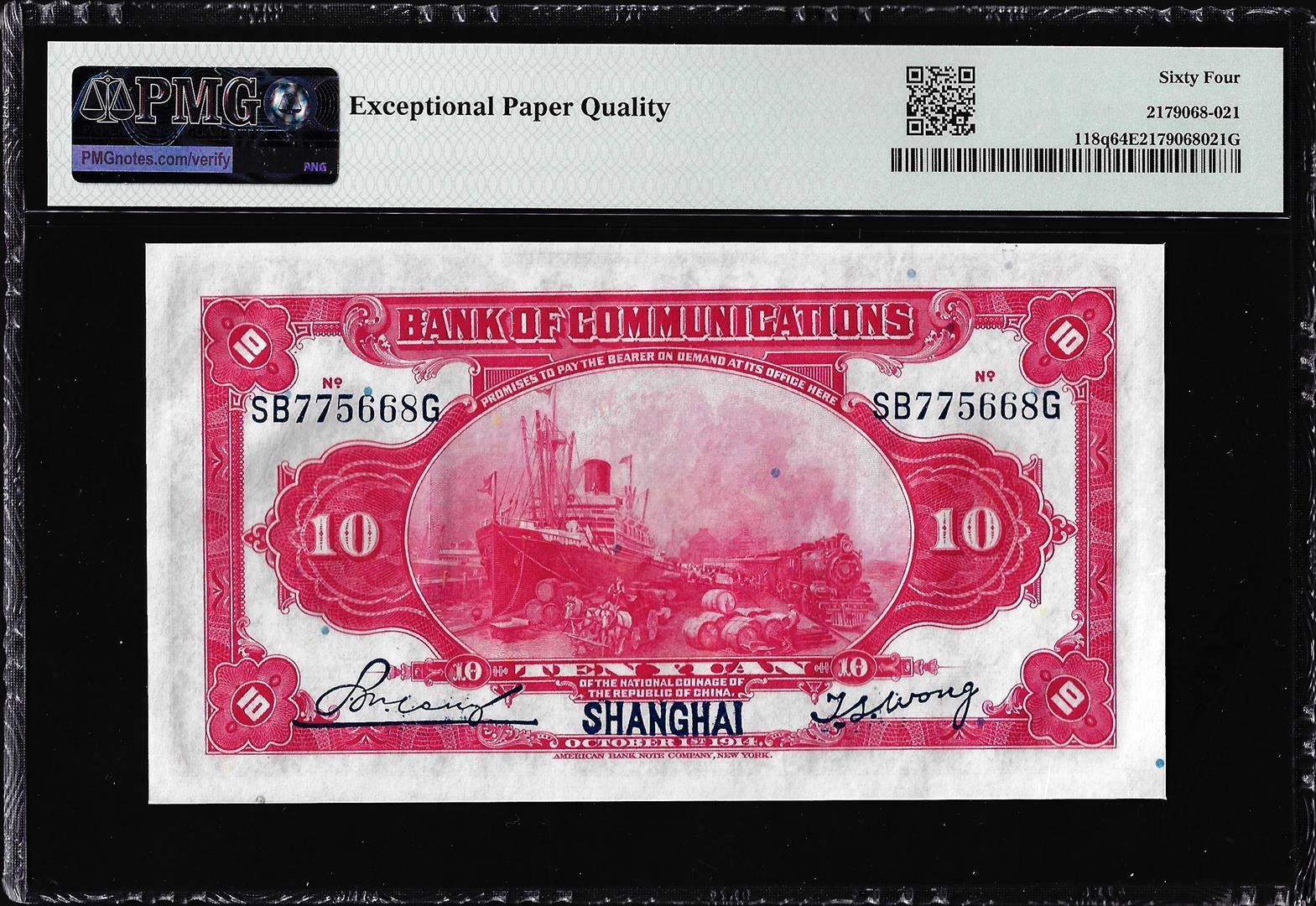 One 1914 China Bank of Communications 10 Yuan Note Pick# 118q PMG Ch. Uncirculated 64EPQ. PMG Certified.