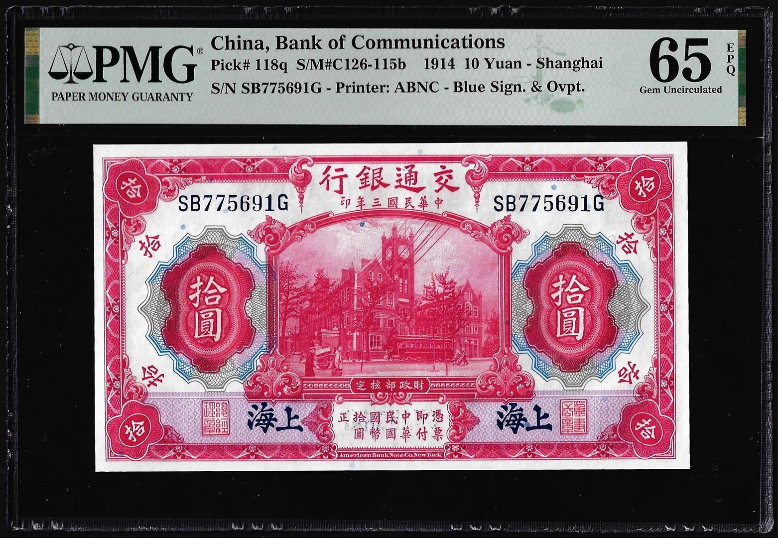 1914 China Bank of Communications 10 Yuan Note Pick# 118q PMG Gem Uncirculated 65EPQ