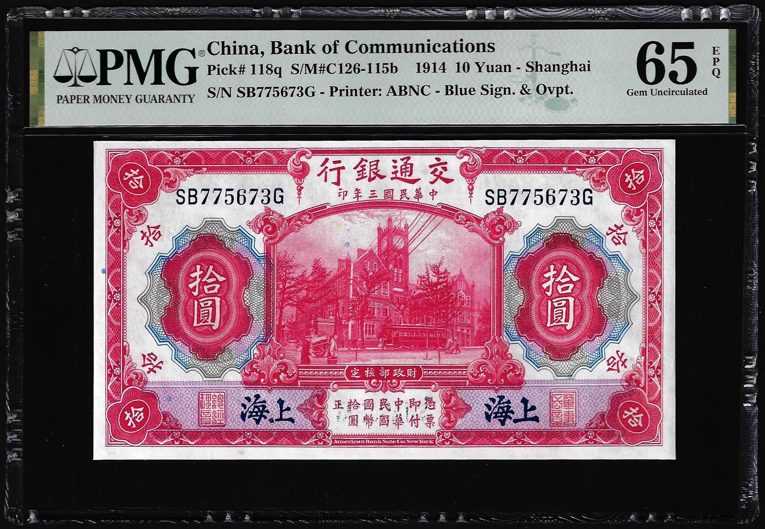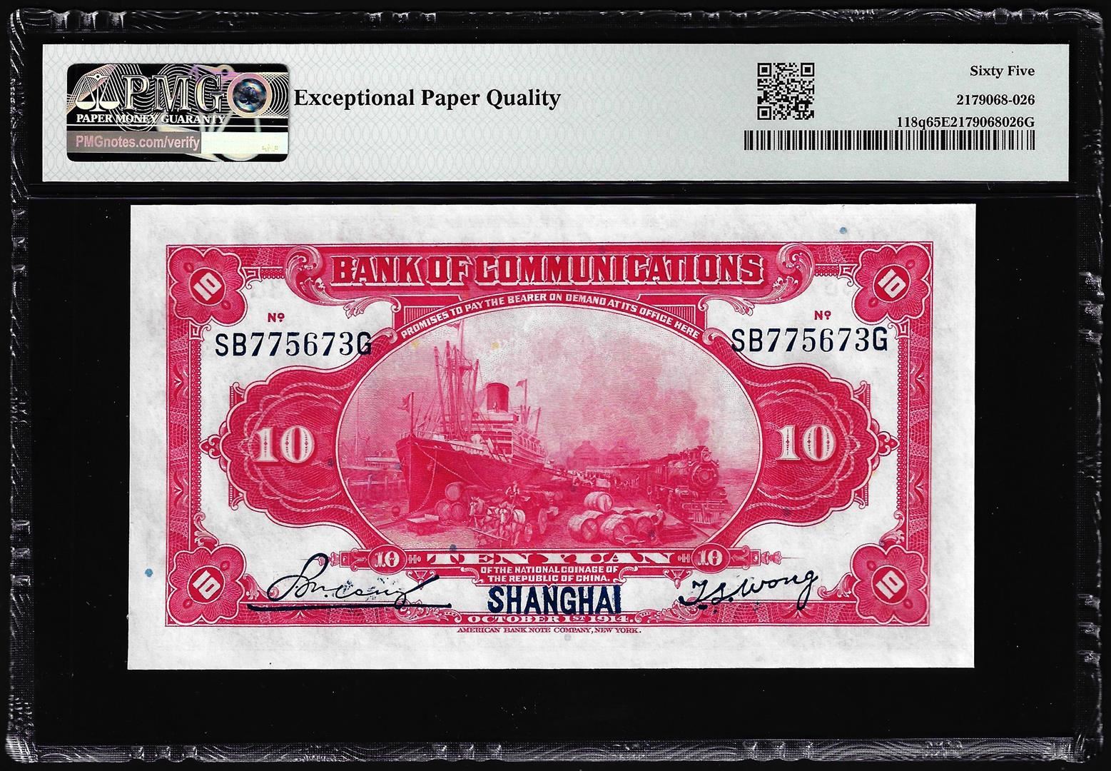 1914 China Bank of Communications 10 Yuan Note Pick# 118q PMG Gem Uncirculated 65EPQ
