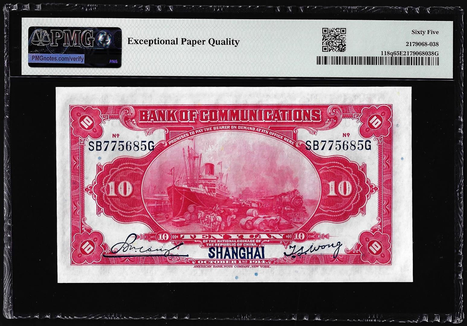 1914 China Bank of Communications 10 Yuan Note Pick# 118q PMG Gem Uncirculated 65EPQ