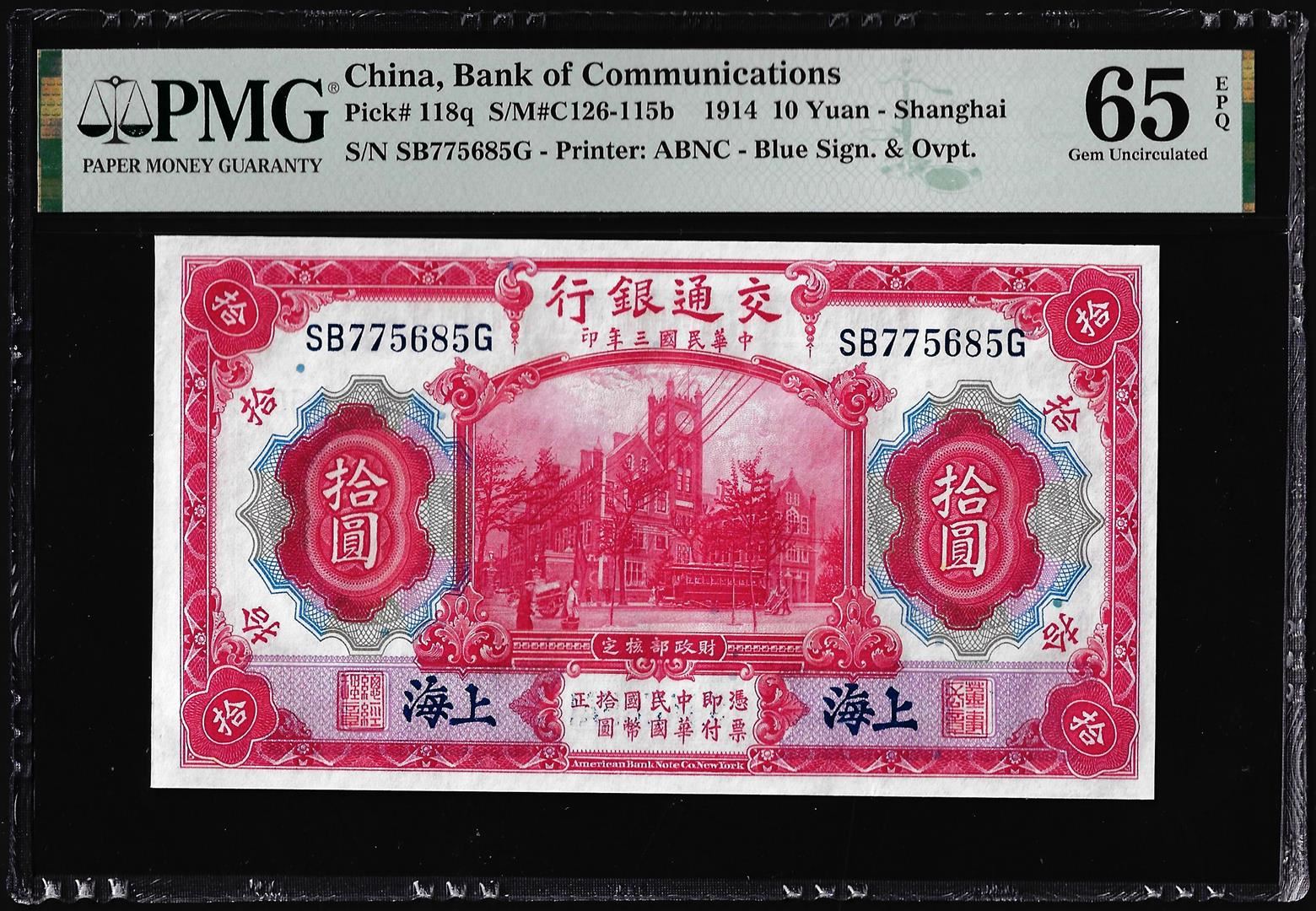 1914 China Bank of Communications 10 Yuan Note Pick# 118q PMG Gem Uncirculated 65EPQ