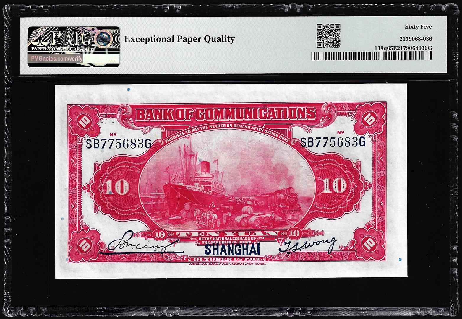 1914 China Bank of Communications 10 Yuan Note Pick# 118q PMG Gem Uncirculated 65EPQ