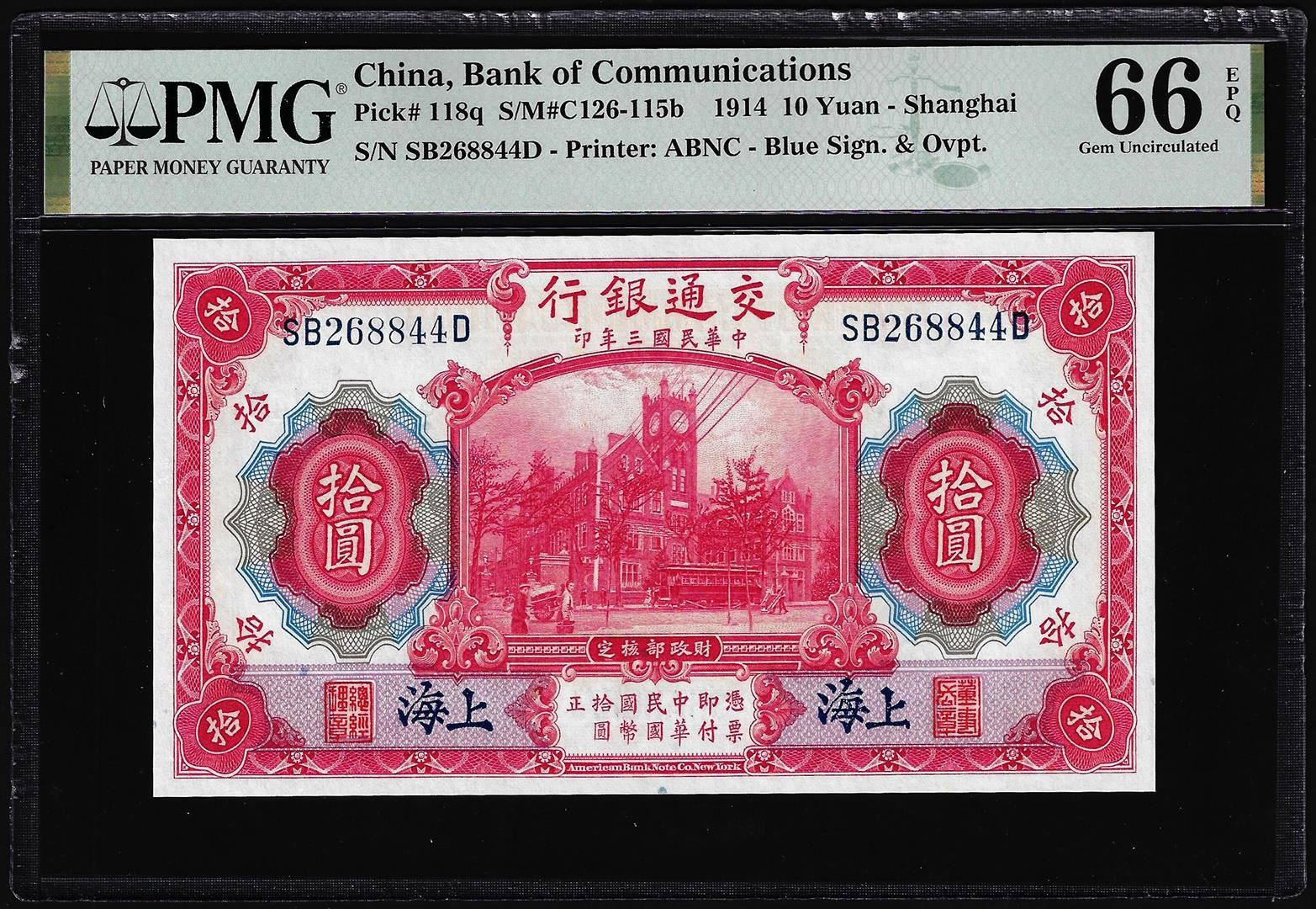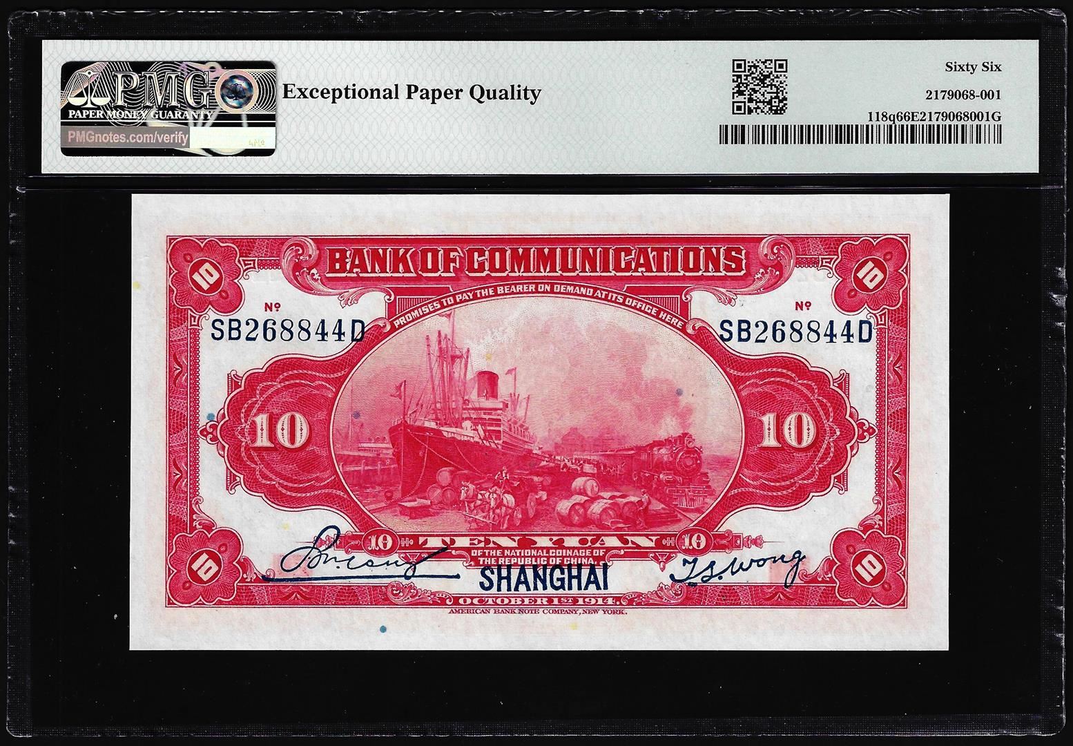 1914 China Bank of Communications 10 Yuan Note Pick# 118q PMG Gem Uncirculated 66EPQ