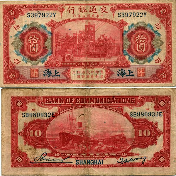 1914 China Shanghai 10 Yuan Note Better Grade (CUR-06878)