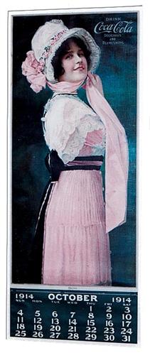 Matted and framed under Plexi. Visible image measures 12.25"x31.25". Seems to be missing the metal strip and comes with an October page. Very bright example, nice cond. overall. One tiny wrinkle and closed tear with minor expert restoration around the "c" and "o" of coca. Otherwise, very nice appearance with almost no wear, minimal soiling, only minor creases and shallow ripples as well as a few tiny miniscule touched up small spots. Mostly extreme lower left dark green field area and at the bottom of her dress. Cond. 8.5-9.0, displays even better.