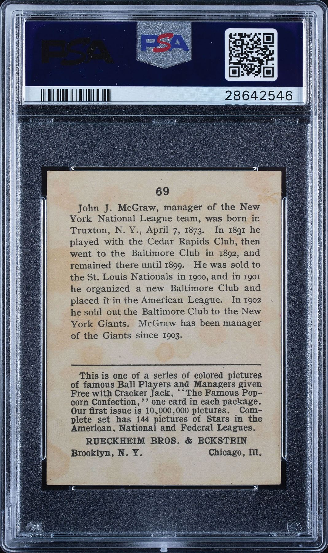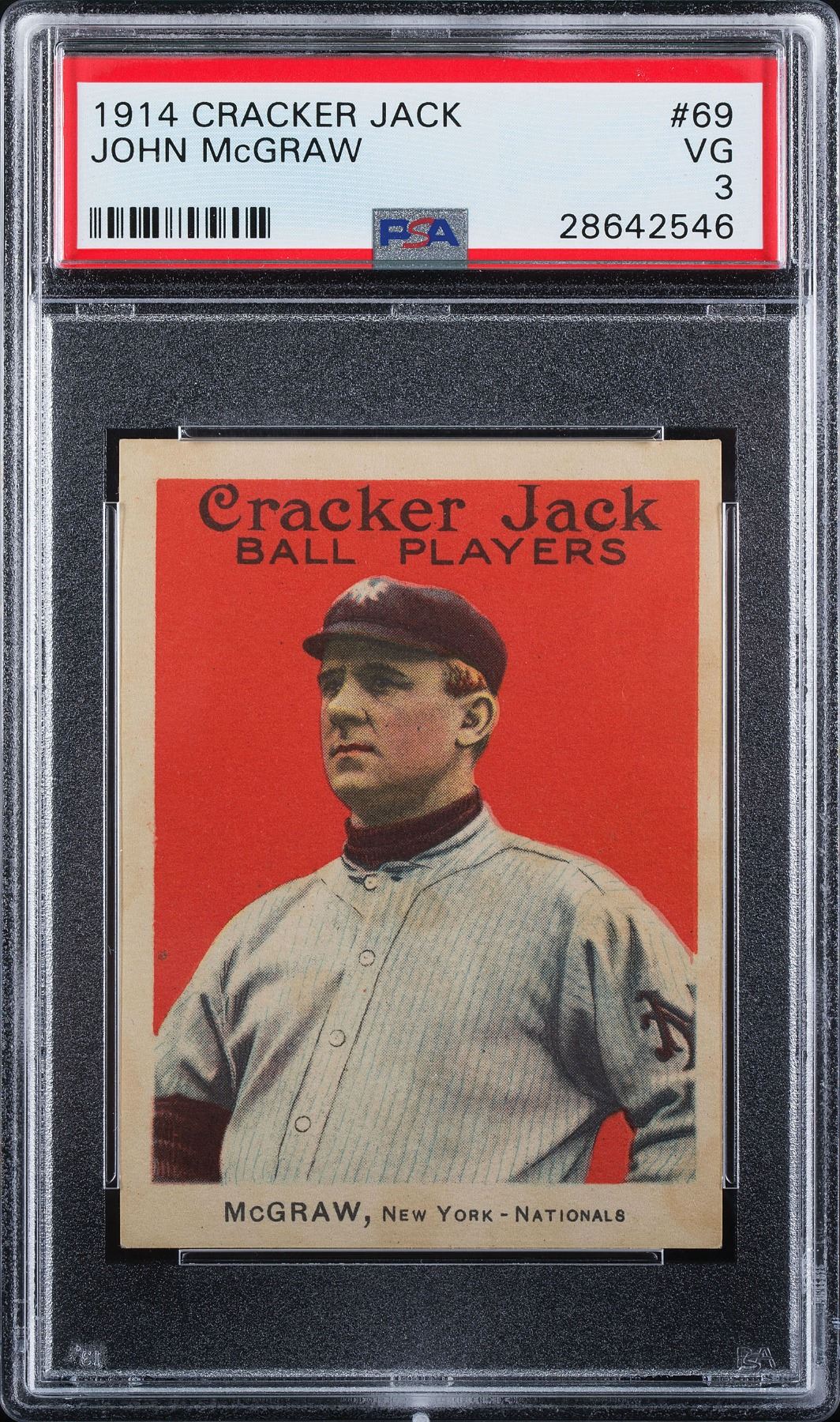 Graded by PSA VG 3. This 1914 card appears EX/MT to NM with square corners, superb color and nice print quality. However, the card does contain moderate staining on the reverse, so common with these 1914 Cracker Jacks, issued only in the boxes of the candy treats. Very strong card, downgraded for light stains.