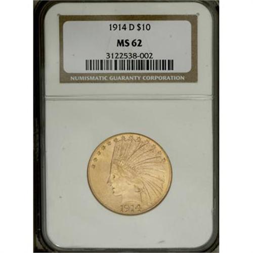 <B>1914-D $10 MS62 NGC.</B></I> NGC Census: (424/329). PCGS Population (381/453). Mintage: 343,500. Numismedia Wsl. Price for NGC/PCGS coin in MS62: $1,050. (#8876)<BR><BR><B>Coin Engraver:</B> Augustus Saint-Gaudens<BR><BR><b>Shipping:</b> Coins & Currency (<a target="_blank" href="http://www.heritageauctions.com/common/shipping.php">view shipping information</a>)