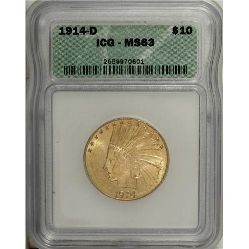 <B>1914-D $10 MS63 ICG.</B></I> Well struck and lustrous with light abrasions on the obverse. The yellow-orange reverse has fewer marks and a clean appearance for the grade.<BR><BR><b>Shipping:</b> Coin/Currency (<a target="_blank" href="http://www.heritageauctions.com/common/shipping.php">view shipping information</a>)