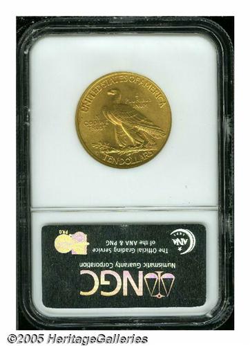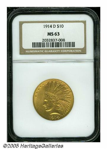 <B>1914-D<$10> MS63 NGC.</B></I> Well struck but exhibiting somewhat subdued luster. A noticeable mark is present on the Indian's cheek.<BR><I>From the Dr. Kurt Peters Collection.</B></I> From the Dr. Kurt Peters Collection.