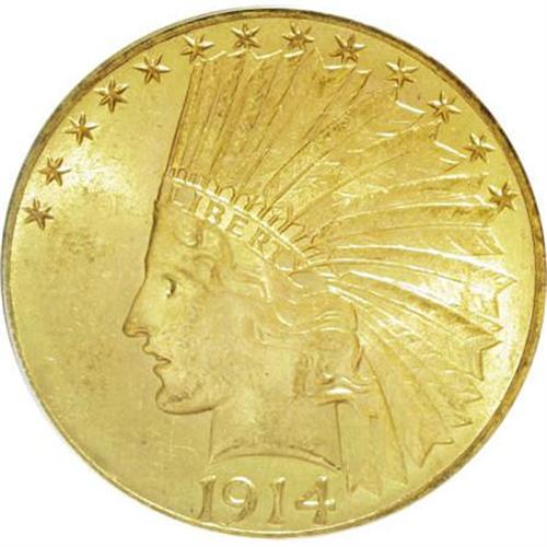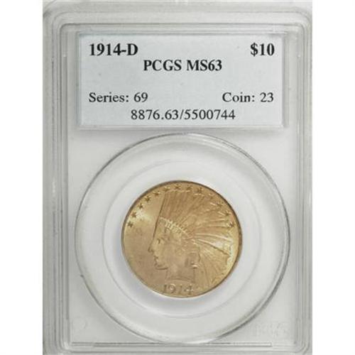 <B>1914-D $10 MS63 PCGS.</B></I> . PCGS Population (276/184). NGC Census: (134/210). Mintage: 343,500. Numismedia Wsl. Price for NGC/PCGS coin in MS63: $2,250. (#8876)<BR><BR><B>Coin Engraver:</B> Augustus Saint-Gaudens<BR><BR><b>Shipping:</b> Coins & Currency (<a target="_blank" href="http://www.heritageauctions.com/common/shipping.php">view shipping information</a>)