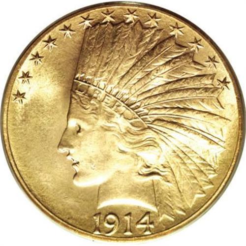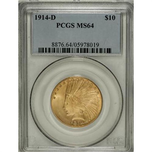 <B>1914-D $10 MS64 PCGS.</B></I> Highly lustrous with lovely lime-gold and peach toning and a bright, radiant appearance on both sides. The obverse is exceptionally clean for the grade, while the reverse shows a few trivial blemishes and a faint grease streak (as made) that extends from just above GO to the eagle's beak.<BR><BR><B>Coin Engraver:</B> Augustus Saint-Gaudens<BR><BR><b>Shipping:</b> Coins & Currency (<a target="_blank" href="http://www.heritageauctions.com/common/shipping.php">view shipping information</a>)