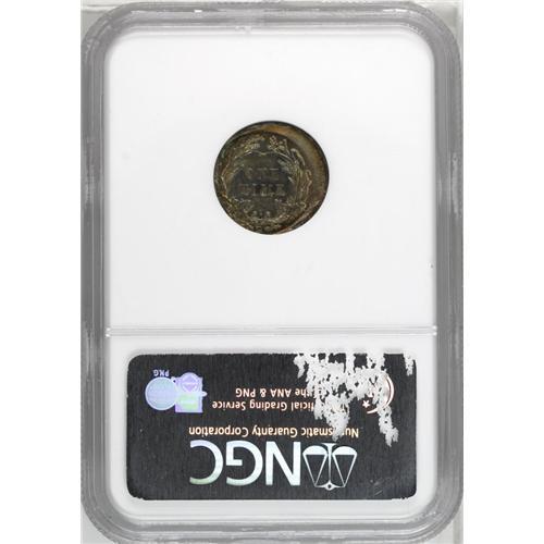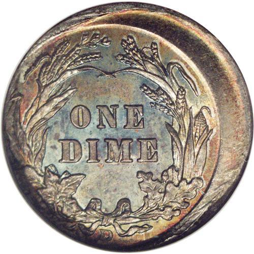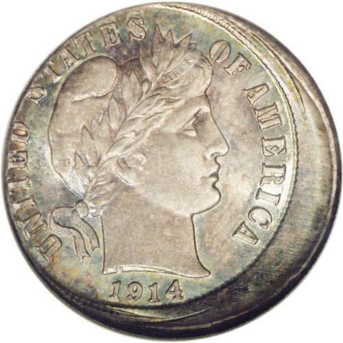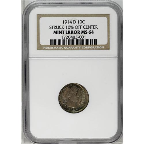 <B>1914-D<10C> Barber Dime--Struck 10% Off-Center--MS64 NGC.</B></I> Approximately 10%, or perhaps slightly more, off-center at 10 o'clock. Sharply struck and fully lustrous with deep iridescent toning on both sides. A few minor blemishes are noted on both sides, but the overall quality is pleasing. This is a desirable piece for either the general error coin collector, or for the Barber coinage specialist.