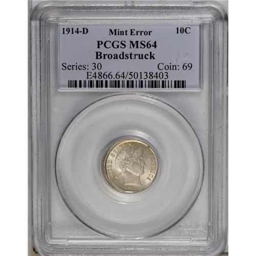 <B>1914-D<10C> Barber Dime--Broadstruck--MS64 PCGS.</B></I> Broadstruck toward 2 o'clock with a wide border in the opposite direction toward 8 o'clock. Fully struck with frosty luster and hints of champagne toning.