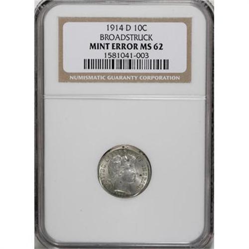 <B>1914-D 10C Barber Dime--Broadstruck--MS62 NGC.</B></I><BR><BR><B>Coin Engraver:</B> Charles E. Barber<BR><BR><b>Shipping:</b> Coins & Currency (<a target="_blank" href="http://www.heritageauctions.com/common/shipping.php">view shipping information</a>)