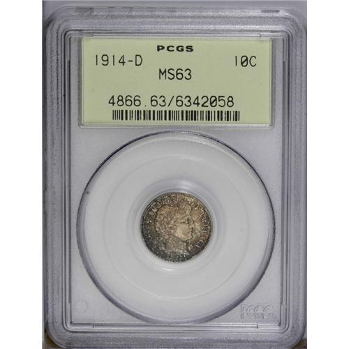 1914-D 10C MS63 PCGS. Both sides have satiny luster be 1914-D[10C] MS63 PCGS.