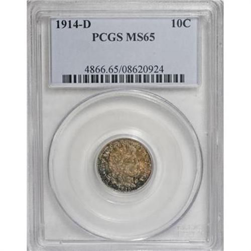 <B>1914-D 10C MS65 PCGS.</B></I> PCGS Population (35/19). NGC Census: (32/19). Mintage: 11,908,000. Numismedia Wsl. Price for NGC/PCGS coin in MS65: $575. (#4866)<BR><BR><B>Coin Engraver:</B> Charles E. Barber<BR><BR><b>Shipping:</b> Coins & Currency (<a target="_blank" href="http://www.heritageauctions.com/common/shipping.php">view shipping information</a>\)